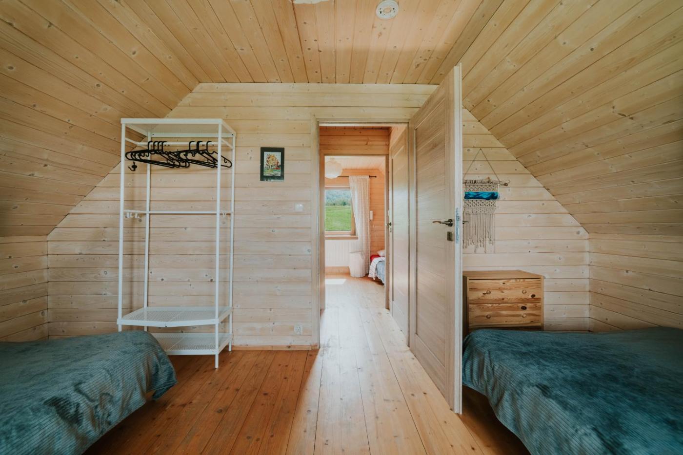 Domek z 2 sypialniami. The fireplace is the standout feature of this chalet. Boasting a private entrance, this chalet features 1 living room, 2 separate bedrooms and 1 bathroom with a shower and a hairdryer. Guests will find a stovetop, a refrigerator, kitchenware and a tea and coffee maker in the kitchenette. The chalet also comes with a barbecue. Featuring a terrace with garden views, this chalet also features a washing machine and a flat-screen TV. The unit has 5 beds. Domek - 6 osobowy. Powierzchnia pokoju ok.: 65 mkw. ;